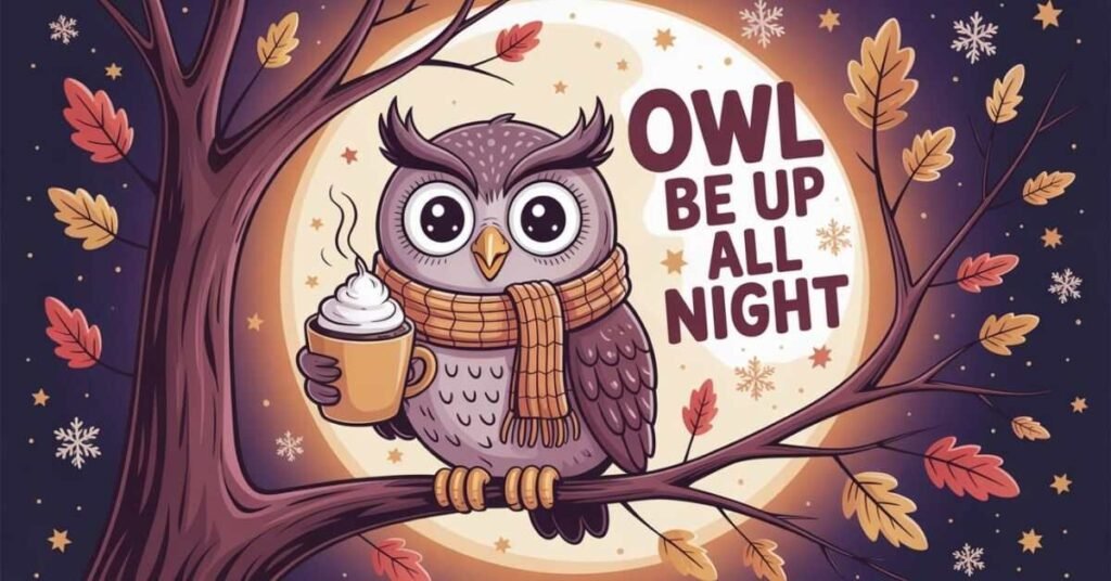 Owls are famous for their nighttime habits, mysterious vibes, and strong connection to fall and Halloween. These nocturnal & seasonal owl puns are perfect for autumn captions, spooky jokes, cozy fall content, and night-owl humor. This section blends nighttime energy, seasonal charm, and owl behavior for maximum fun and shareability.